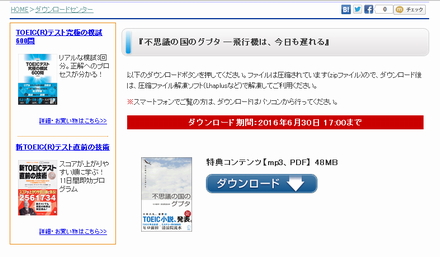 アルクの「ダウンロードセンター」では、数多くの書籍に付随するダウンロードコンテンツが提供されています。そのページで『不思議の国のグプタ−飛行機は、今日も遅れる』を見つけてクリックしてください。登録フォームが現れますので、必要事項を記入してフォームを送信してください。