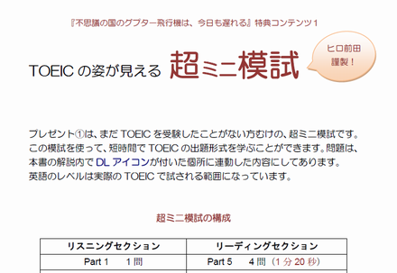 TOEICの受験経験が豊富ではない方むけに制作された超ミニ模試です。短時間でTOEICの出題形式を学ぶことができます。本書の解説の中にある「DLアイコン」と連動した内容です。