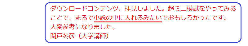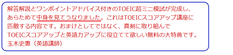 超ミニ模試にチャレンジした後で、このファイルで答え合わせができます。解答と解説だけでなく、ヒロ前田による「ワンポイントアドバイス」も収録されています。受験スキルを磨くために役立ちます。