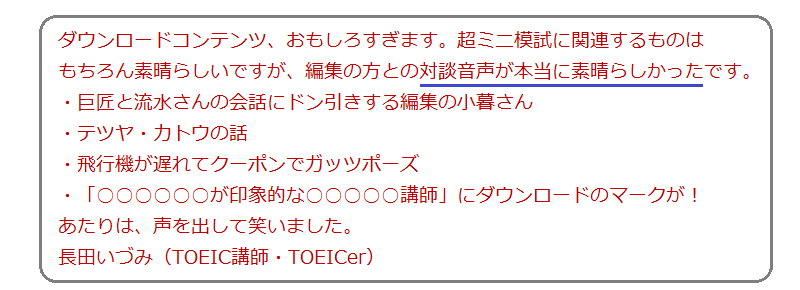 「3回チャレンジ法」はTOEICの模試を効果的に活用するメソッドです。興味があれば、検索エンジンで調べてみてください。実践している人のブログが見つかります。